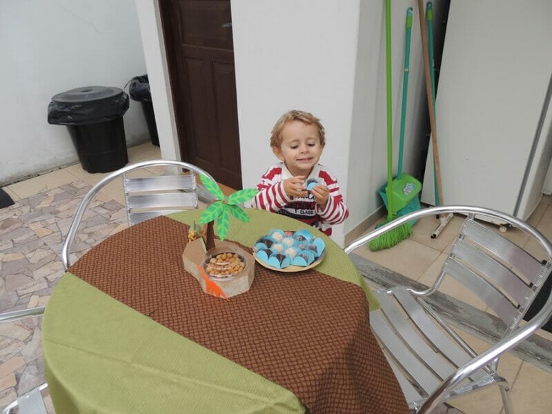 Mas a minha parte preferida da decoração foram os centros de mesa que a minha cunhada fez: com um coqueiro, dinossauros, nome do filhote e potinho para colocar “ovinhos” de dinossauro (amendoins). Ficou lindo demais e o Vinicius se acabou de tanto comer amendoim!